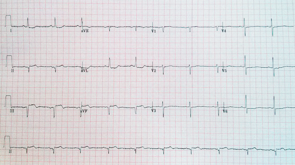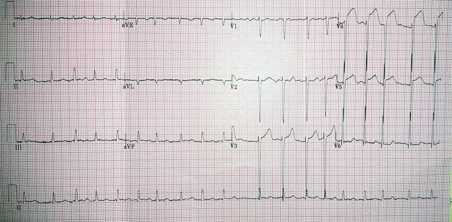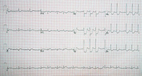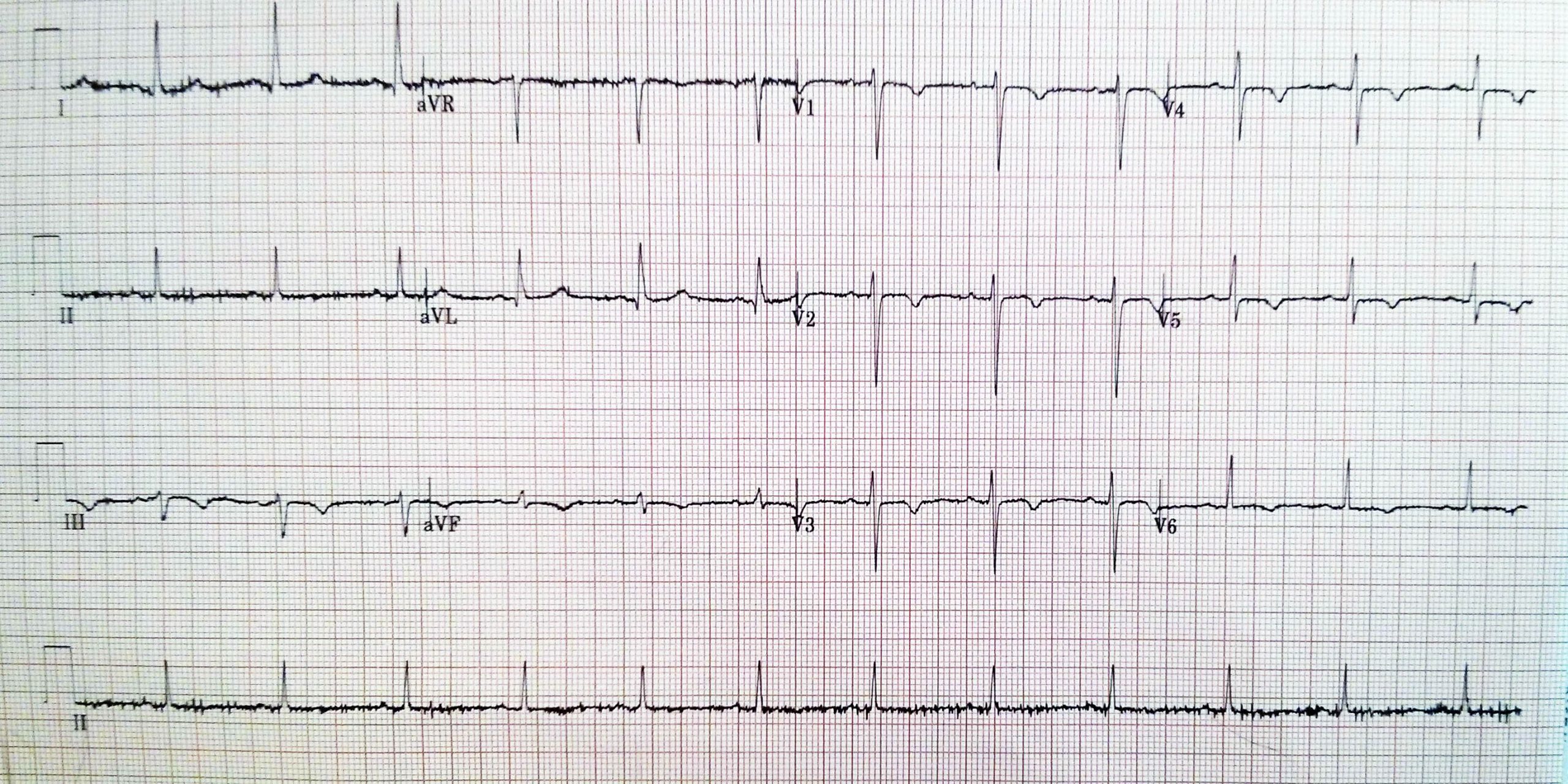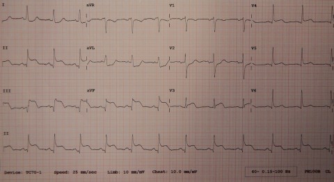 A 62 year patient presents to the emergency department with central crushing chest pain. He has a long history of hypertension, asthma and duodenal ulcer. He also sees his GP for obsessive compulse disorder. The admitting doctor performs an ECG and implements the appropriate treatment. What are the ECG findings (shown) ?